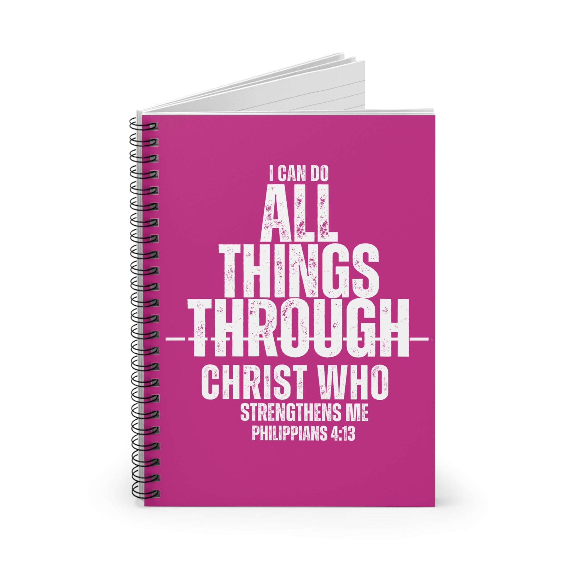 A compact spiral notebook that keeps faith and daily plans close at hand. The bold front print — a distressed, white block-letter rendering of Philippians 4:13 — sits on a vivid magenta cover for a confident, uplifting look. Inside, smooth 90gsm ruled pages give your pen fluid, consistent lines for journaling, sermon notes, Bible study reflections, or to-do lists. The sturdy 350gsm covers protect your pages, while the metal spiral lets the book lie flat or fold back when you need one-handed writing. A built-in document pocket on the inside back cover stores loose papers, prayer lists, or bulletins so nothing gets lost. Sized at 6 x 8 inches, it slips easily into a tote, Bible cover, or backpack — ready for small-group meetings, church services, or quiet mornings at the kitchen table.